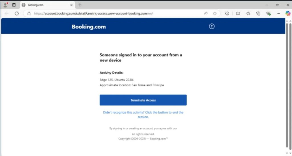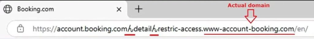 网络钓鱼活动使用看似合法的 Booking[.]com 地址,例如看起来像“https://account.booking[.]com/detail/restric-access.www-account-booking[.]com/en/“。