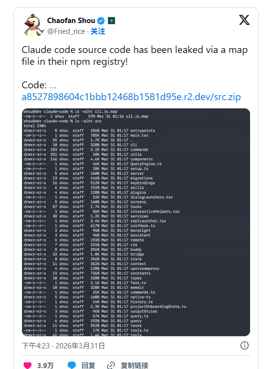 “Claude Code 源代码通过他们的 npm 注册表中的地图文件泄露了!”该用户发帖。